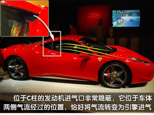 当通过车身两侧的气流经过驾驶室后方的C柱时候,隐藏在C柱内部的引擎进气口恰好在这里等待着新鲜的空气。通过位于C柱内的引擎进气口,发动机将获得充足的新鲜空气,并且法拉利的工程师还告诉我们:当车辆的时速达到100公里/小时开始,由于气流经进气口以及进气道所产生的“动态增压”效应,会使发动机的功率额外增加5马力,最终实现570匹马力的最大功率。