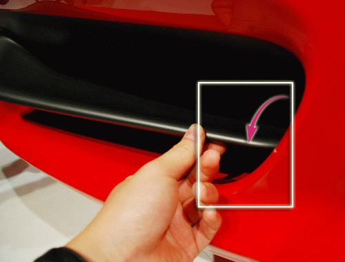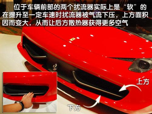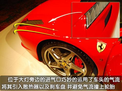 转到车头的上方您会发现在458Italia的大灯一侧会有一个隐藏的通风口,这里的设计能够让从车头过来的气流在经过这里的时候进入通风口,使其变为引擎散热器以及前轮刹车系统的冷却气流,类似这样的巧妙设计还有很多。