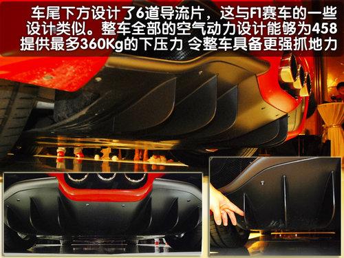在458Italia的车尾底部,六道导流片在车辆高速行驶的时候为车辆提供充足的下压力,以及后轮的附着力。在极限状态下全车的因空气动力学设计而产生的额外下压力高达360公斤,这相当于5-7名成年人的体重总和。