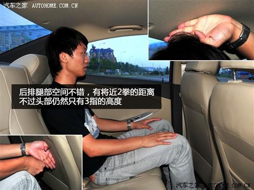 图中的体验着身高175cm左右,在调整好合适的坐姿之后,前排头部只有三指,而后排也仅仅3指,所以这点证明了流线型的车身线条还是会给头部一些小的影响。当然,超长的轴距直接带来了腿部空间的提升,作为小型车来说后排能达到两拳的长度确实不多见。