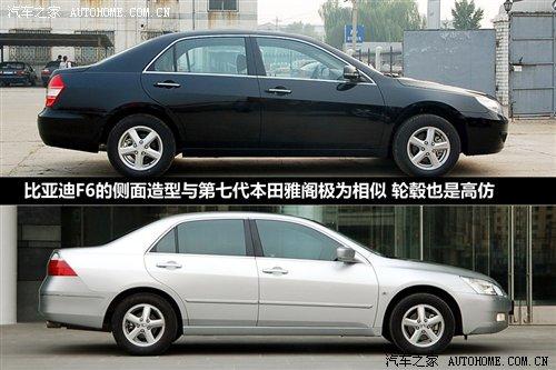 在外观上,比亚迪F6最具代表性的模仿之处在于侧面,因为它与第七代本田雅阁极度相似,而且连轮毂的造型也如出一辙,其实真的不用模仿得这么细致。F6的尾灯与奔驰S级的非常神似,不敢说完全模仿,但借鉴之处还是能看得出来的。
