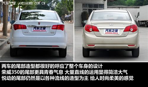 两车的车尾都很好的延续了车身设计的整体性,350车尾的线条依然简洁利索,甚至带有一些轿跑的感觉,反观悦动的车尾也延续了自己流畅柔美的特点,尾灯的形状都和头灯十分相似。从图片来看两车后备厢开口的高度也相差无几。