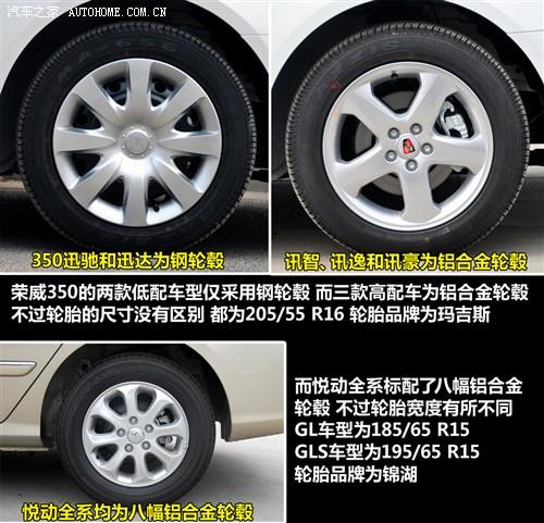 荣威350在高低配车型上有两种不同的轮毂,但轮胎的尺寸都是205/55 R16。而悦动则是全系标配8幅铝合金轮毂,但在低配车型上仅使用了185/65 R15轮胎,而高配车型上将轮胎的宽度升级到195。从效果上看,荣威350更宽更大的轮胎显然更漂亮,但悦动标配铝合金轮毂更厚道一些。