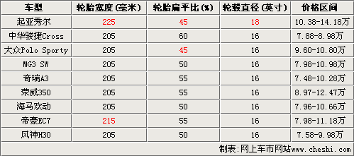 在以上车型之中,帝豪EC7系列全系都配备了215/55R16轮胎,各类尺寸参数都比较平均,所能影响的性能和舒适度在同级车中比较领先。另外,大众Polo Sporty与秀尔一样,是采用45较低扁平比的轮胎,提升了整车的运动气质。大体来看,奇瑞A3、荣威350等偏重家用的车型,轮胎扁平比都偏高,而海马欢动、MG3 SW等偏向运动的车型,扁平比则略低。