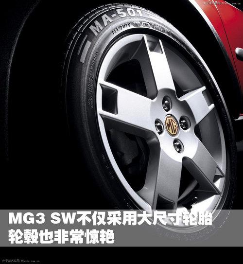 第一眼看到MG3sw,我们就会被纯正的英式风格所震撼。在MG3sw的车头部分,我们可以看到很多分体设计的元素,前大灯、雾灯、中网都采用了对称的排列方式,在蕴含动感的同时也有一丝绅士风范。车头和车尾低平而饱满,引擎盖上3道线条均匀地勾勒出一种力量感。最小离地间隙大于160mm的高通过性底盘,与车身颜色不同的全身大包围,都表现出了MG3sw所具有的通过能力。