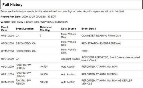 在这完整的历史报告中可以看出这车是在2008年7月挂牌上路的,车牌注册地点是美国加州(CA),在2009年6月时出过车祸(Accident Reported, Event Date is date reported),车祸严重情形从这报告中看不出来,2009年8月时在标场出售,出售时里程数为10524英里,在美国通常法院、银行或贷款公司会将长期租赁车(Leased car)或法拍车丢到标场去拍卖(auction),长期租赁车是租约到期(通常为2-4年,也有一年的)还给银行或贷款公司。