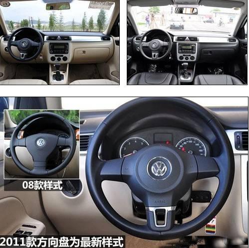 相比老款带有木纹装饰的内饰,2011款宝来有黑色内饰和上深下浅两种内饰可供选择,中控有两处最大的改变,一个是将老款车型上被人诟病的老气的木纹装饰改为了更加时尚的金属贴片。另一个则是方向盘换为了和高尔(报价图片参数)夫(报价图片参数)6相同的家族最新样式。