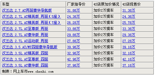 丰田汉兰达有着宽大的车身,拥有创新的、宽敞的内部空间,并配备了豪华、舒适的内饰。而且,汉兰达标配了同级别车型中最高标准的安全装备。这款SUV行驶中非常安静,而且灵敏性超凡,将多功能性和驾驶舒适性汇于一身。根据网上车市价格监测系统显示,目前广汽汉兰达最高优惠现金8千元,最低售价27.28万元,车源较紧张,详细价格如下表: