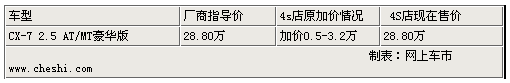 作为一款具有跑车化外观和马自达操控DNA的中型SUV,马自达CX-7自去年11月上市以来一直备受关注。根据网上车市价格监测系统显示,自CX-7上市以来,各4S店一直持续提现车加价0.5万-3.2万元,而近期北京马自达4S店出现了平价销售现象,售价为厂商指导价28.8万,少量现车供应。具体车型价格如下: