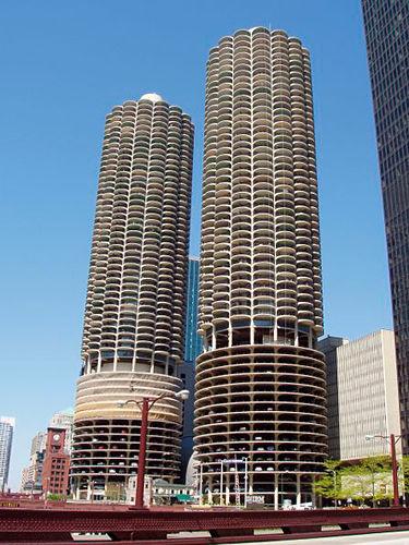 在1964年完工的这两座双胞胎塔,被设计成位于市中心广场的小镇——是音乐厅、零售商店、溜冰场和保龄球馆的复合体。塔自身的结构中包括了车库:65层的塔楼下边的三分之一是螺旋上升型的车库,每层可容纳896辆车。该车库因1979年的故事片《亡命大捕头》(The Hunter)而闻名,在这部电影里,史蒂夫·麦奎因扮演赏金猎人,在车库中上演高速汽车追逐战。在车库顶部,麦奎因追踪目标的1980年的庞蒂亚克失去了控制,冲出了车库,跌入下面的芝加哥河。