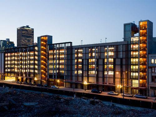 这座耗资2800万美元,由旧百货商场翻修而成的车库,在设计中采用了老温哥华桥的部件。