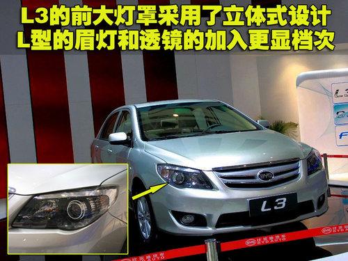 比亚迪L3的车灯设计也颇有特点,L型的镀铬灯眉一方面代表了L3的名字,也与中网的镀铬条相呼应。立体式车灯罩也为前脸增添了一丝生气,全系配备透镜,夜间使用带来更佳的照明聚光效果。