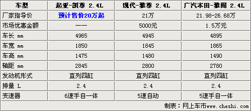 据北京地区进口起亚4S店销售人员透露,起亚的全新中级轿车凯尊与广汽本田的雅阁一个级别,预计低配车型的售价在20万元起。目前4S店现已开始接受预订,订金1万元,第一批车主将于8月底提到现车。同时从上表的数据看出,起亚凯尊的车身尺寸与同平台现代雅尊和本田雅阁相比,是尺寸最大的,同时轴距也是三款车型中最长的,这意味着它的车内空间是最宽敞的。三款车型的发动机形式都是直列四缸2.4L的发动机,变速器方面则是凯尊明显占有优势,配备的6速手自一体变速器。由以上数据看,如果起亚凯尊定价合理的话,上市后会有不错的成绩。下面就让我们提前去感受一下即将上市的起亚Cadenza凯尊。