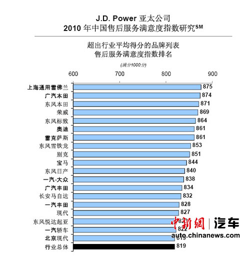 2010年中国售后服务满意度指数研究的主要评价因子包括服务质量、服务后交车、服务启动、服务顾问以及服务设施等五项因子,以测评车主在购车的12至24个月期间,对品牌售后服务部门所提供保养和维修服务的满意度进行评价。在此次研究中,广汽本田以874分的总分(总分1000分)荣获第二,仅以一分之差与冠军失之交臂,但同比2009年结果(870分),分数有进一步的提升。