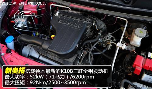 新奥拓搭载了铃木最新开发的K10B全铝发动机,最大功率71Ps/6200rpm,最大扭矩92N·m/2500-3500rpm,低转速区间即可输出较高的扭矩,发动机调教很适合城市驾驶,发动机采用正时链条传动,终身免更换;另外这款发动机的燃油经济性非常出色。