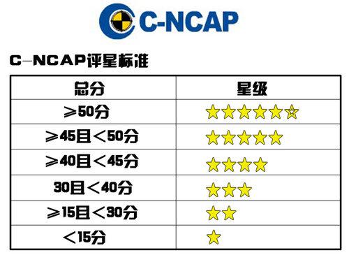 C-NCAP是将在市场上购买的新车型按照比我国现有强制性标准更严格和更全面的要求进行碰撞安全性能测试,评价结果按星级划分并公开发布,旨在给予消费者系统、客观的车辆信息,促进企业按照更高的安全标准开发和生产,从而有效减少道路交通事故的伤害及损失。C-NCAP的评分标准主要分为四个部分,正面100%重叠刚性壁障碰撞试验、正面40%重叠可变形壁障碰撞试验、可变形移动壁障侧面碰撞试验以及车辆自身所配备的气囊的安全配置的附加得分。四项分数相加后,得出的总分,再根据上面表格中的评分标准评定安全级别。分数和星级越高的车型,在撞击时所造成的伤害越小。