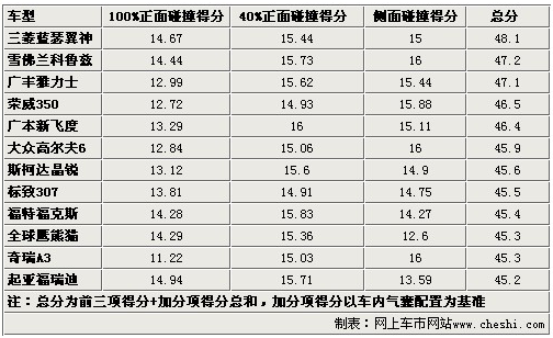 通过以上表格,我们可以看出这样一个现象,12款车当中涉及自主品牌、日韩系列和德美系列各国车型。很多人一直坚信德美系的车要比其他两类车要结实,但事实证明他们的成绩也并非那么无懈可击。看来C-NCAP的铁证也可以做一回流言终结者了,不过这12款车全部达到了45分以上,也就是C=NCAP五星级安全标准。至于传说中的五星半级别,在比较常见的国产车中只有雅阁和CR-V达到。