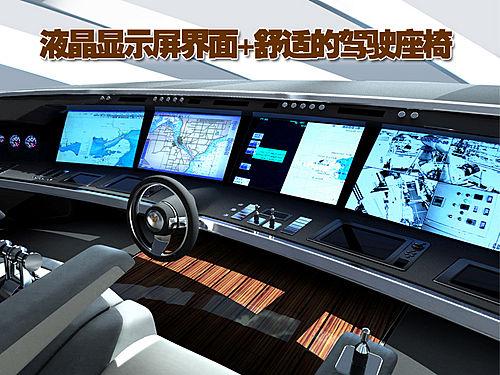 从官方设计图上我们可以看到起奢华的内部装饰,液晶显示屏的操控界面,宽大舒适的驾驶舱座椅,在其船舱还配置了宽敞的酒吧间,木质的地板以及灰色的装饰增添了雅致的风格。此外还有舒适的长沙发以及小型会议桌等等。