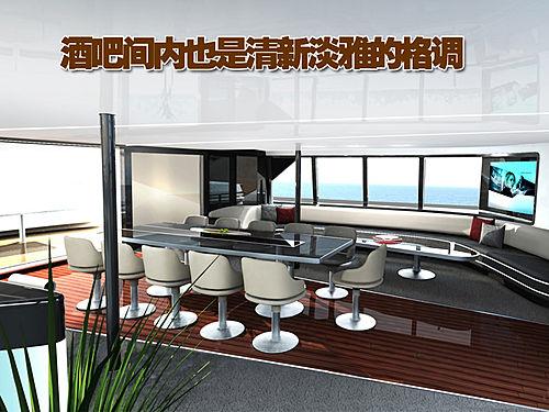 双体船内部的的酒吧间的中间放置的为一个较大的长方形桌子,两面相向各放置了5个吧台椅,而较窄的一端则放置了一个吧台椅。在这一设置的-侧放置的则是舒适的长沙发,背后为明亮的窗户,此外还配置了宽大的液晶显示屏,另一侧则是高高的吧台设计。