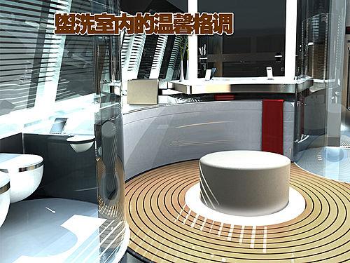 除了酒吧间外,其盥洗室也是同样典雅的风格。优质的铝金属装潢增添了贵族的气息,环形的设计营造了温馨的氛围。轮船的尾端则是一个惬意的小型休闲空间,原型的小桌前放置这四个小巧舒适的沙发,在其后面则是两个深色的沙发,从宽大的一体式窗户投进了明媚灿烂的阳光。