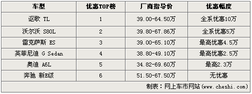 要说宝马全新一代5系LI车型的上市撼动整个中级车市场,这样的说法绝对不算严重。同级别车型都没闲着,纷纷打出降价牌。排行榜中高居榜首的是本田的高端品牌讴歌TL车型,以全系优惠10万元的巨大幅度拔得头筹;中间分列二三四五位的是沃尔沃S80L:全系优惠5万、雷克萨斯ES:最高优惠4.5万、英菲尼迪G系列:最高优惠2.5万、奥迪A6L最高优惠2.3万。唯一一款没有降价的车型是奔驰刚刚上市才不久的国产新E级,全系没有优惠政策,购车需预定。