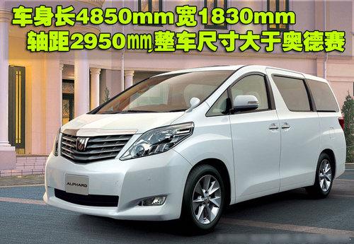 目前日本本土销售的丰田Alphard是其第二代车型,分为两驱和四驱两个版本,两驱车型的车身长4850mm 。宽1830 mm ,高1890mm,四驱车型的车身长为4850 mm ,车宽1830 mm ,高1905mm,而轴距均为2950mm。
