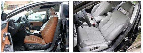 座椅方面同样体现出了两款车型不同的设计理念,CC豪华版的棕色波浪式座椅,看起来包裹性出色,侧向给予的支持力也还算到位,如果您另对黑色座椅钟爱尤佳,那么选装Alcantara材质拼装的翻毛真皮座椅一定会是个更好的选择。迈腾浅色的内饰看起来更加厚重,偏向家用风格,坐上去感觉包裹性一般,但真皮座椅质地还算比较不错。