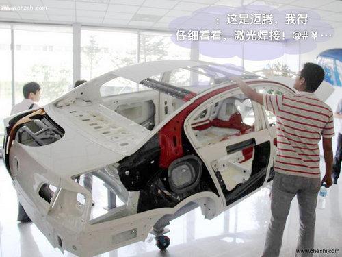 在焊装车间的一进门位置,我们就看到了一台迈腾的解剖车,这里只有车辆的结构件,不包含一些内饰配件。这个只剩下骨架的车身可以清楚的看到迈腾的车身结构是什么样的。