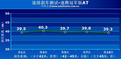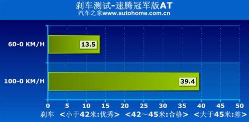 冠军版与速腾其他车型相比刹车的优势比较明显,车重大于速腾1.4TSI,但实际的制动距离短了1米,宽胎起了直观重要的作用,在刹车时轮胎与地面接触面积大,保证了足够的摩擦力;10次连续制动测试,冠军版刹车系统表现出的稳定性也让我们放心,距离偏差很小。