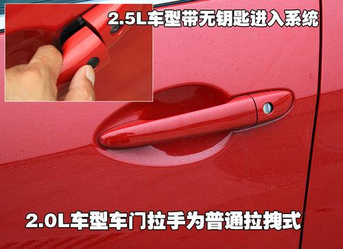与车身同色的车外门把手开启车门时力度适中,周围与车门板金接缝均匀,开启的过程中无松垮的感觉。不过这款车并没有采用智能钥匙系统,消费者要进入爱车只能通过钥匙开启车门。