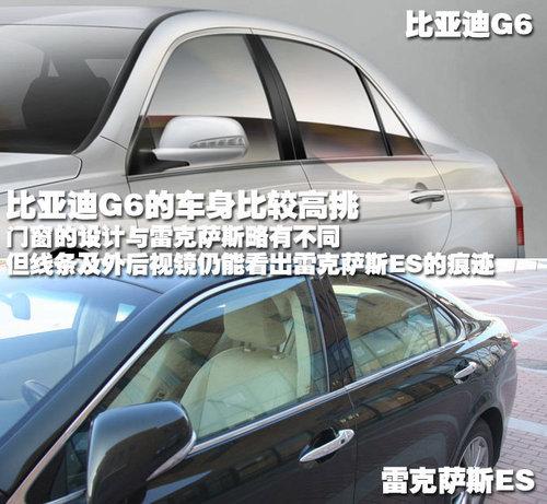 虽然以上图片的角度有所不同,但我们可以从线条看的出来,比亚迪G6的车身比较高挑,门窗的线条虽然非常相似,但轨迹有明显不同。比亚迪G6也采用了可折叠外后视镜,并且集成了转向灯功能,从上图中可以看出来是LED转向灯,与雷克萨斯ES的风格非常相近。