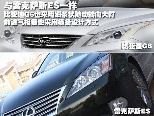 比亚迪G6的前脸是与雷克萨斯ES最为相似的地方,从图片中可以看到,比亚迪G6的前脸进气格栅采用横条贯穿,设计方式与雷克萨斯ES一模一样。所不同的是,雷克萨斯ES的进气格栅采用质感十足的四个镀铬条,而比亚迪G6只采用3个装饰条,显得有几分单薄。