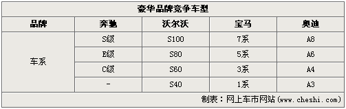 在国内沃尔沃产品一直以高对手半级的定位竞争,S40因此成了宝马3系、奥迪A4的竞品,而实际上S60才是它们的对手,将于年底引入国内销售,此时S40与S60双重攻势下,相信在入门级豪华车市场能够取得更好的成绩。而S80L的竞争对手则是宝马5系、奔驰E以及奥迪A6L,这样的格局下S100则是沃尔沃急需补充的高端豪华车,以便能在需求旺盛的高端市场占有一席之地。以沃尔沃轿车的命名规则来看,S40、S60、S80的延续则是S100。