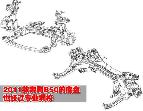 2011款奔腾B50依然采用老款1.6L的发动机,而且变速箱也没有任何变化。但2011款奔腾B50的在底盘方面进行了专业的调校。前减震器增加了复原弹簧,对长度和阻尼进行了调整,而后减震器也对阻尼阻尼进行调整;横向稳定杆的直径增加,刚度也有调整;缓冲块高度和刚性的调整,还调整了开口胶套的橡胶硬度。