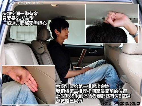 汉兰达3.5升车型都为7座,由于车身比较宽大,使得它的第三排座椅容下两个胖子也问题不大,或许是为了照顾第三排的空间,第二排座椅的空间不算特别宽敞,身高为1.85米的乘客调到合适的驾驶位置,后排腿部到前排只剩下3指的余量。关于汉兰达的详细体验和测试文章,请参看以下链接。