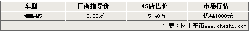 奇瑞高端品牌-瑞麒相继推出M1、G5、X1之后,M1三厢版车型M5已经悄然在北京地区销售,1.3L手动豪华版售价5.58万元。