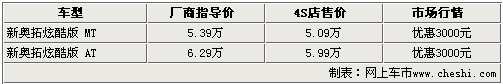 新奥拓炫酷版与普通版新奥拓车型相比,外观、内饰及配置方面均有明显变化。炫酷版新奥拓车型新增了车顶扰流板、前后以及两侧运动包围、侧面防擦条,内饰方面添加了炫彩装饰套件、灵炫动感座椅以及深色尚酷内饰,配置方面将原有音响CD升级为GPS智能导航+音频输入接口。