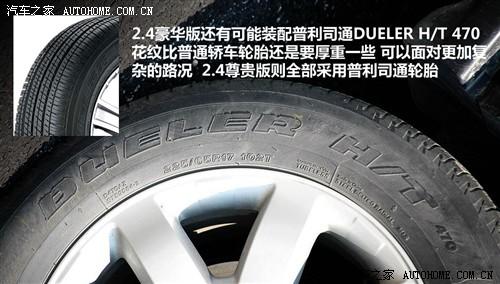 据本田厂家工作人员介绍,CR-V的2.4升豪华版会根据车辆生产的批次不同搭载不同的轮胎,除了上面介绍的邓禄普GRANDTREK ST30系列之外,还可能装配普利司通DUELER H/T 470轮胎,这款轮胎也是一款结合了公路和野外行驶能力的混合型轮胎,而在导航版车型上则全部使用的该产品。据了解,米其林轮胎已经在2010款车型上停止使用了。