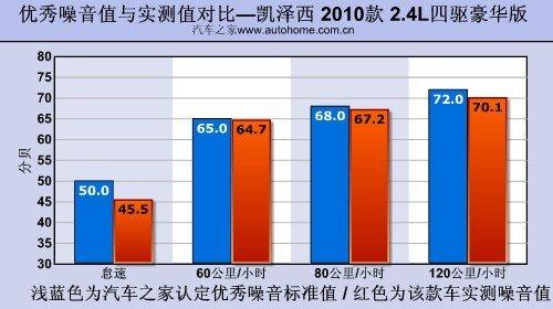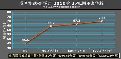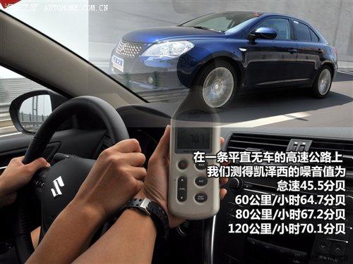 在一条平直无车的高速公路上,我们测得凯泽西的噪音值为:怠速45.5分贝;60公里/小时64.7分贝;80公里/小时67.2分贝;120公里/小时70.1分贝。这样的水平在同级别中算是比较安静的,完全不输于那些以舒适性见长的车型。