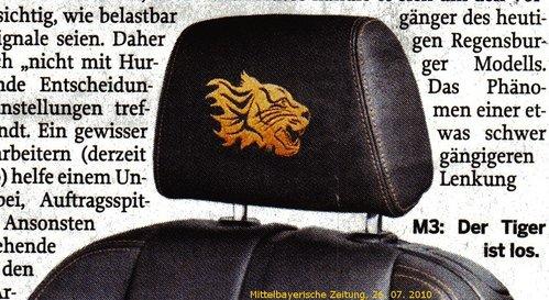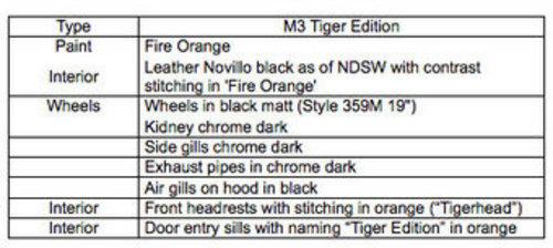 外观方面,M3 Tiger特别版的进气格栅、反光镜边缘都使用了黑色,而车轮部分也升级为宝马的359M系列(16辐)运动化锻造黑色19英寸轮毂,配合银色的镀铬排气管。内饰部分,M3 Tiger纪念版的内饰为黑色真皮坐椅,对应火焰橙的走线。