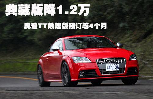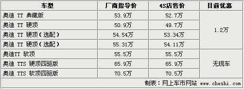 据4S店销售人员介绍:目前奥迪TT已上市的典藏版车型店 内有现车,售价为53.9万元,TT标准版车型有现车,售50.9万元,但还有2款在50.9万元基本款车型上增配车型,分别售54.54万及55.31 万,以上这4款车型都可优惠1.2万元,车身颜色共有白色、红色、银色及日光橙色供挑选。奥迪TT典藏版相对在售TT车型不同的是,这款车配以橘色车身及 运动套件,车内车外都进行运动改装,看起来十分漂亮。如需预定TT及TTS其他颜色及车款,需等待4-6个月时间,由于是按照车主需求定制车型,所以等待时间较长。