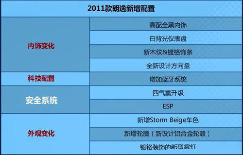 根据经销商处获得的信息,2011款朗逸有三款动力9款车型,另外大部分车型都可选择选装包。具体的车型配置和选装件内容还没有确切的消息。