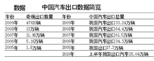 上半年,奇瑞汽车累计出口3.8万辆,同比增长154.3%。7月份,奇瑞汽车终端销量达到45454辆,不仅继续同比增长30.8%,保持了自主品牌乘用车企业第一位,并且出口也高达8834辆,同比增长200%,并创下了全球金融危机以来21个月的新高。