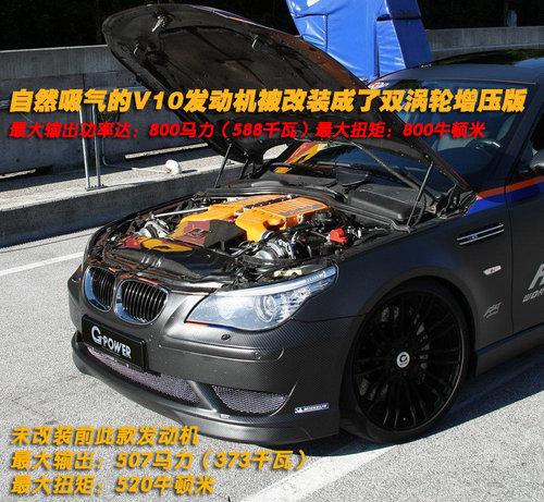 G – Power打造的这款M5是以老款的M5为基础,在本已经非常强大的V10发动机仓中加装了两个涡轮增压器,通过一系列的电脑以及油路等相关调校,让老款的M5的动力性甚至超过了V12发动机。超过370km/h的最高时速比拼F1赛车。