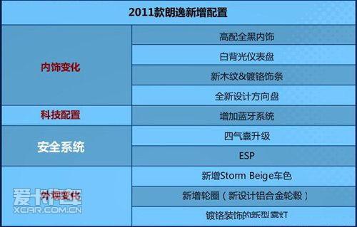 内饰方面,仪表盘的背光改为白色,中控面板采用新的木纹及镀铬饰条,高配车型还提供全黑内饰。另外,2011款朗逸还增加了ESP电子稳定系统、蓝牙系统以及升级的4气囊装备等。