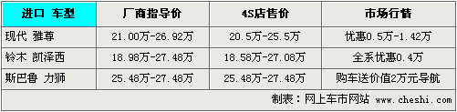 在20—30万的价格区间内,可以说进口中级车的可选择性并不是很多,目前销量较为突出的则是斯巴鲁的力狮车型,目前购买可获赠车载导航,而新推出不久的铃木凯泽西在配置上相当完备,近期购买可获得4千元的优惠,进口现代雅尊则是少数人的偏爱,但在优惠幅度上最高,优惠后最低仅售20.5万元。