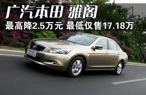 当提到中级车型大家也许会不约而同的想起广本雅阁,新雅阁凭借其大气的外观、舒适的空间和豪华的配置对于中级轿车市场的构成起到了举足轻重的作用。去年,广汽本田又对第8代雅阁进行了小改款,对原来车型的配置有一定程度提升,部分车型增加了智能钥匙和后遮阳板等配置,提高了雅阁整体车型的性价比。近日根据网上车市价格监测系统显示,目前雅阁现金最高优惠2.5万元,最低售价逼平17万。具体价格以及优惠幅度如下: