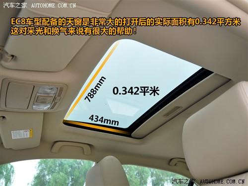 较长的车身尺寸使得EC8车型在后备箱容积上也有同级车中相对较大的容积-504L,不过后备箱看后有些不方便,进入大件物品比较费劲。