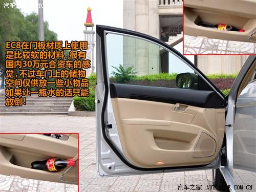 上面我们说了,帝豪EC8在内饰上使用的材质上均为软质材料,摸起来很有手感,材质的质地与做工与国内20-30万元的车型很有一拼。不过在一些小细节上,EC8还需进行一些处理,如车门上的储物槽!