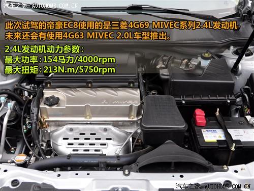 此次试驾的帝豪EC8车型全称为EC825,采用的是三菱2.4L 4G69发动机,这台发动机可是有历史念头了,国内很多厂家都在使用这台发动机作为自己的动力单元。而帝豪EC8使用的这台发动机则是原装进口的4G69 MIVEC发动机,虽然从数据上看并么有什么亮点,但是发动机本身质量比较过硬,同时在油耗方面比较控制的相对较好。
